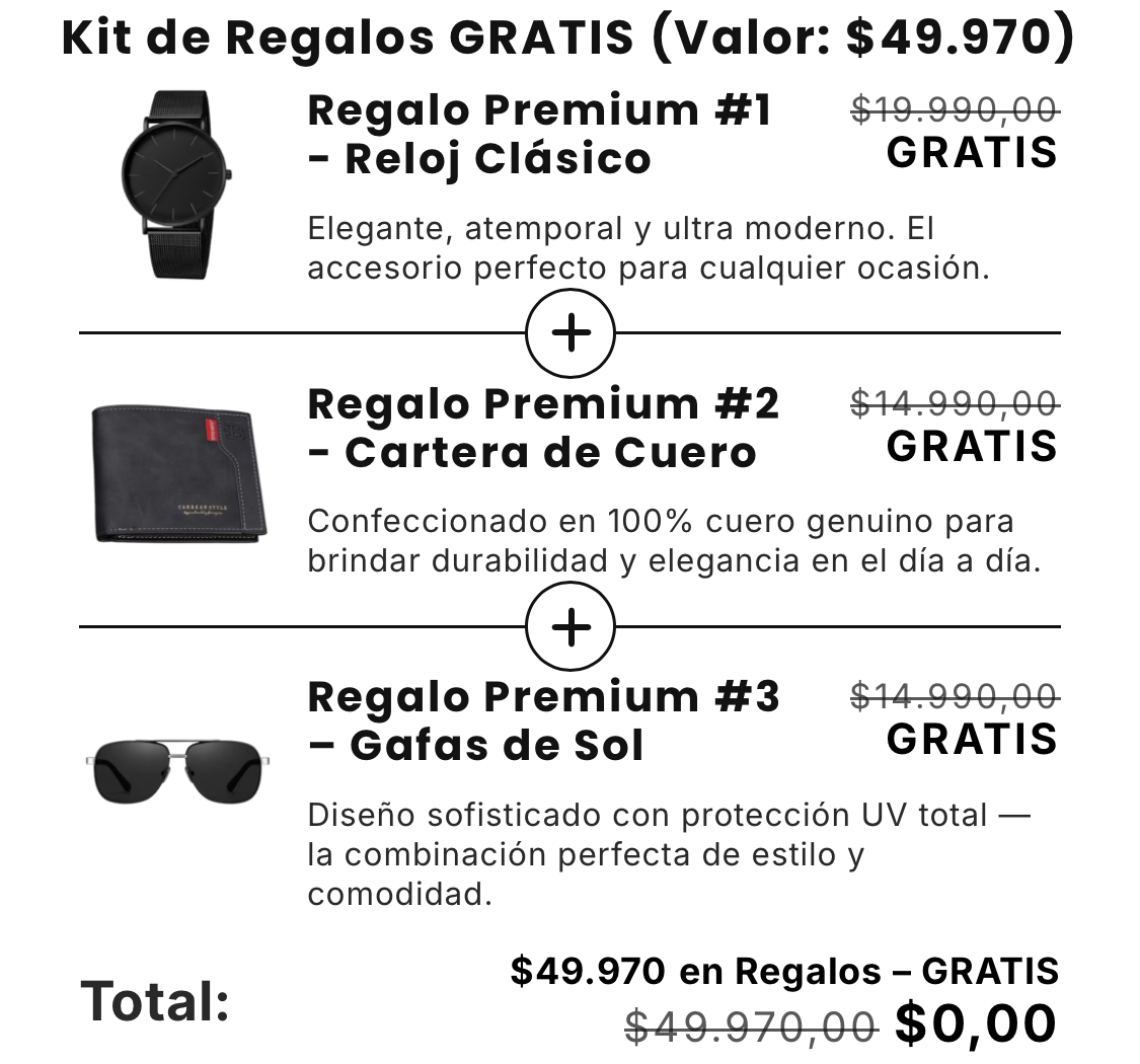 Obtén una cartera, un reloj y unos lentes de sol totalmente GRATIS con tu compra.